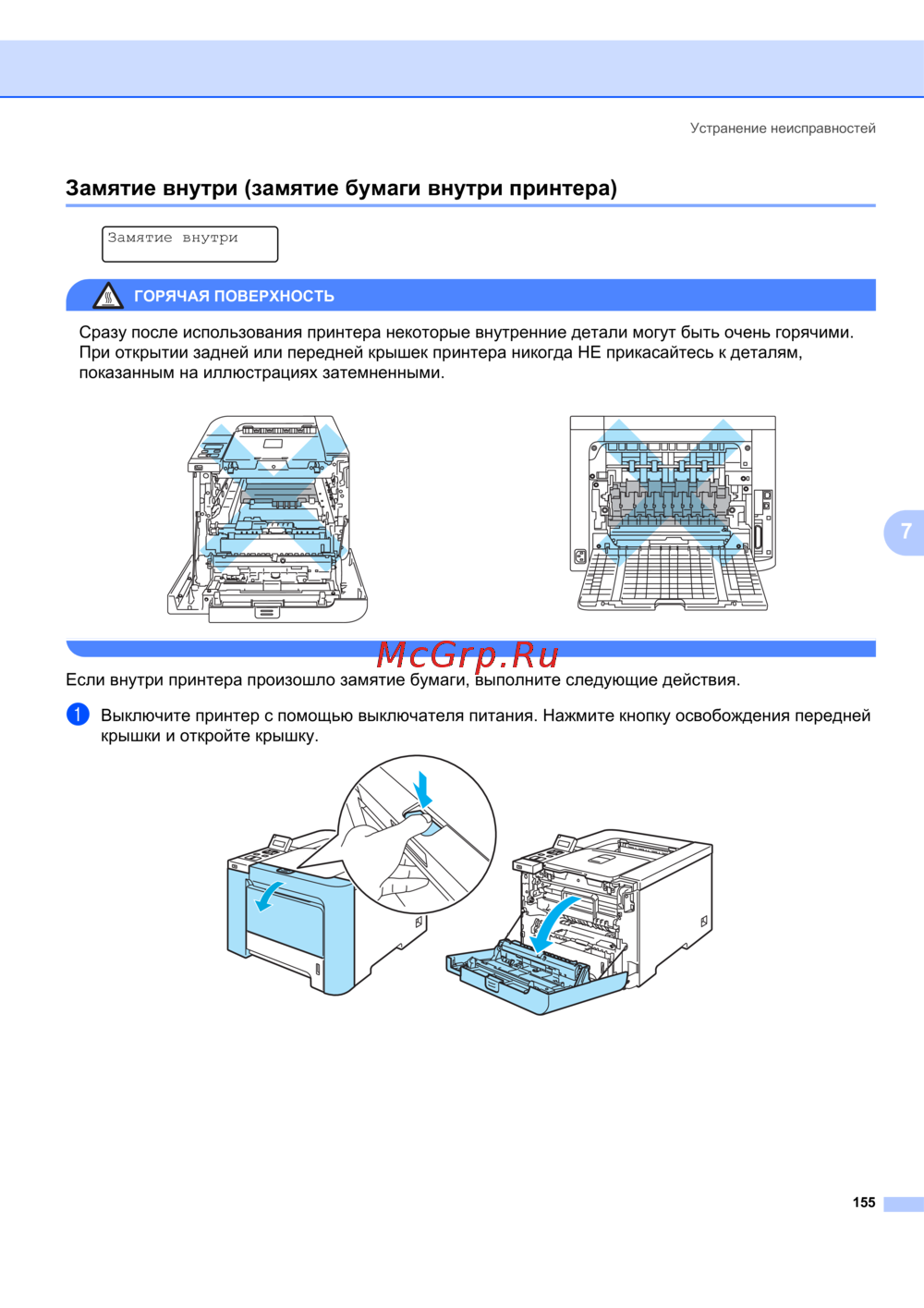 Сразу после использования принтера некоторые внутренние детали могут быть очень горячими.