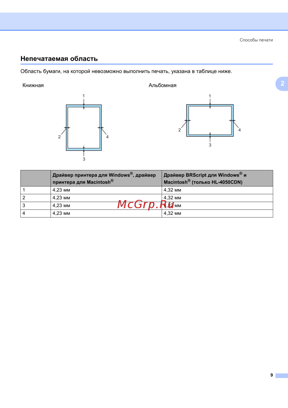 Brother HL-4050CDN [17/202] Область бумаги на которой невозможно выполнить печать указана в таблице ниже