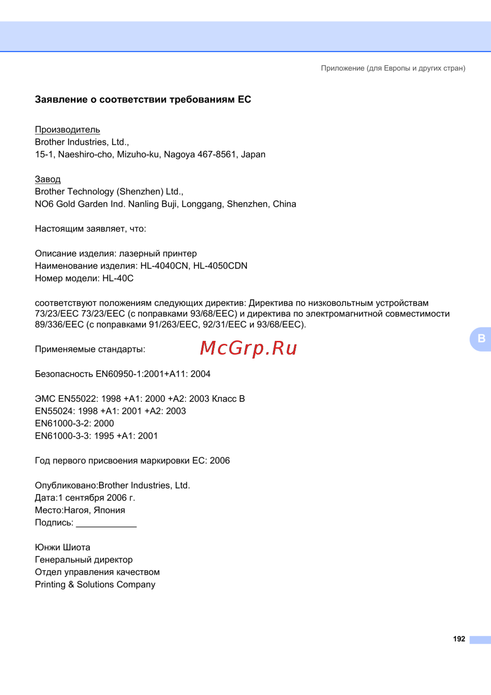 Brother HL-4050CDN — заявление о соответствии лазерного принтера требованиям ЕС [200/202]