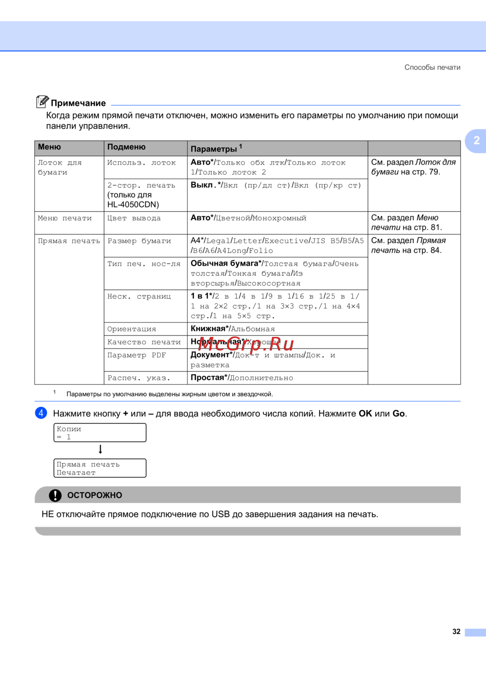 Когда режим прямой печати отключен, можно изменить его параметры по умолчанию при помощи