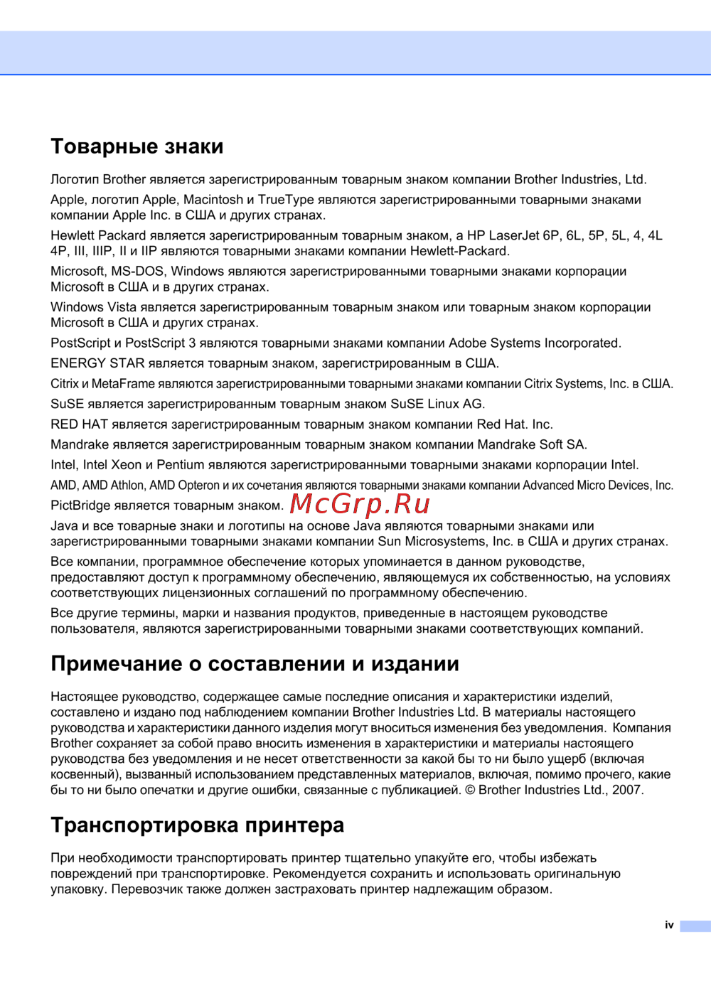 Brother HL-4050CDN — информация о товарных знаках и транспортировке принтера [5/202]