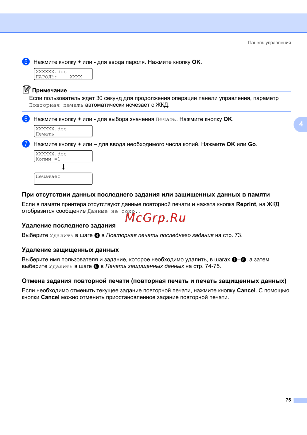 Узнайте, как использовать панель управления для ввода пароля, печати копий и удаления заданий. Подробные шаги и советы для эффективного управления печатью.