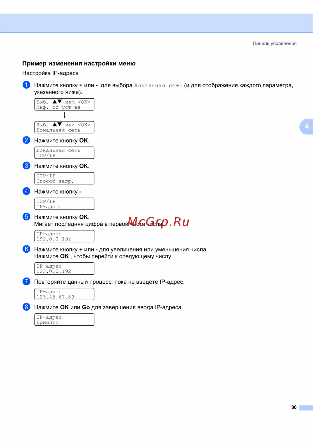 Brother HL-4050CDN — настройка IP-адреса на панели управления устройства [94/202]
