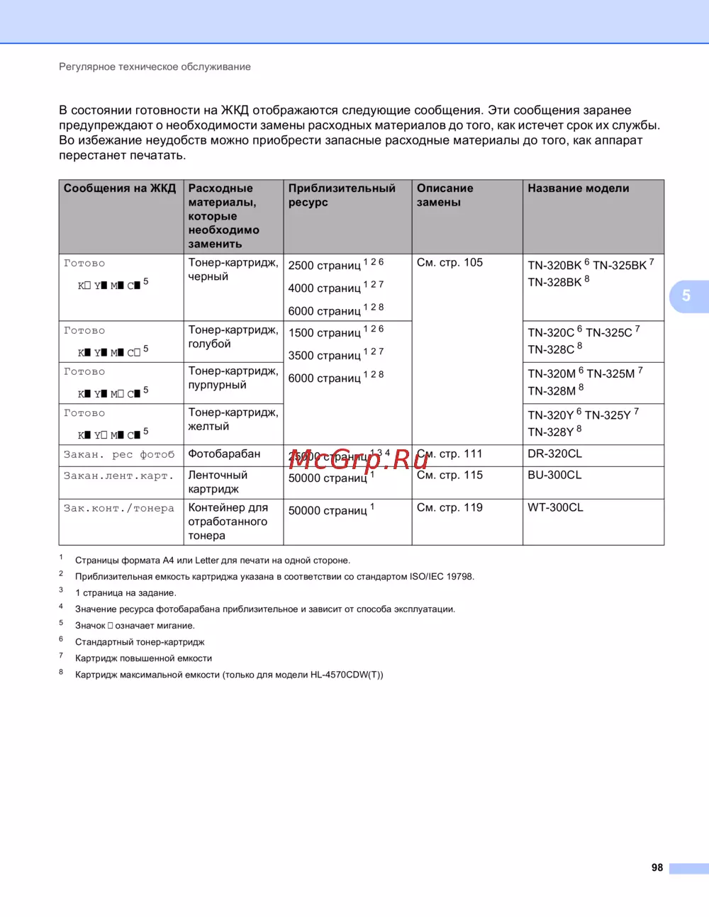 ![Brother HL-4570CDWT [103/214] В состоянии готовности на жкд отображаются следующие сообщения эти сообщения заранее предупреждают о необходимости замены расходных материалов до того как истечет срок их службы во избежание неудобств можно приобрести запасные расходные материалы до того как аппарат перестанет печатать](/views2/1025228/page103/bg67.png)