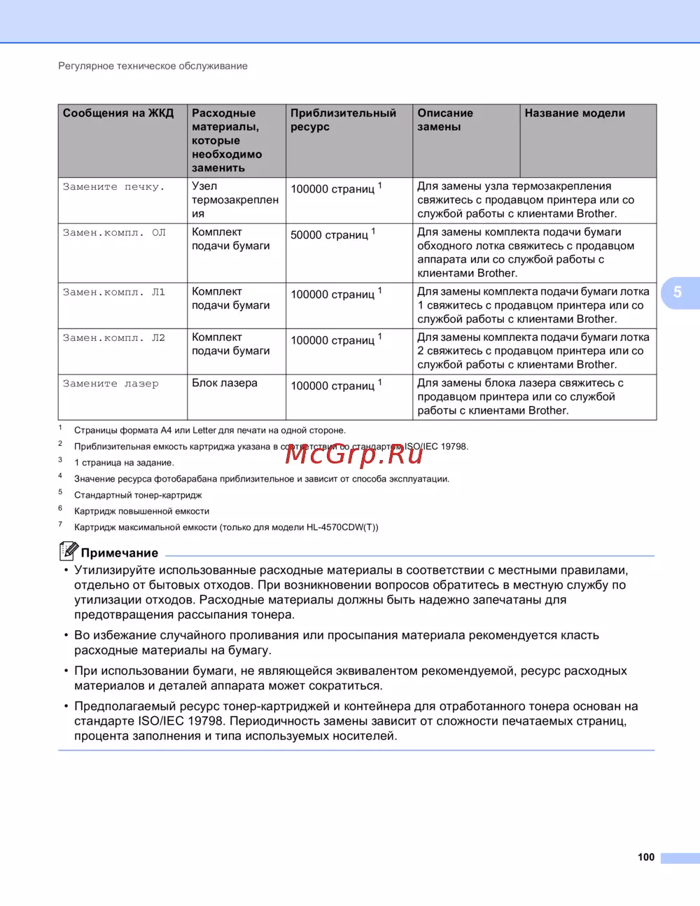 • Предполагаемый ресурс тонер-картриджей и контейнера для отработанного тонера основан на