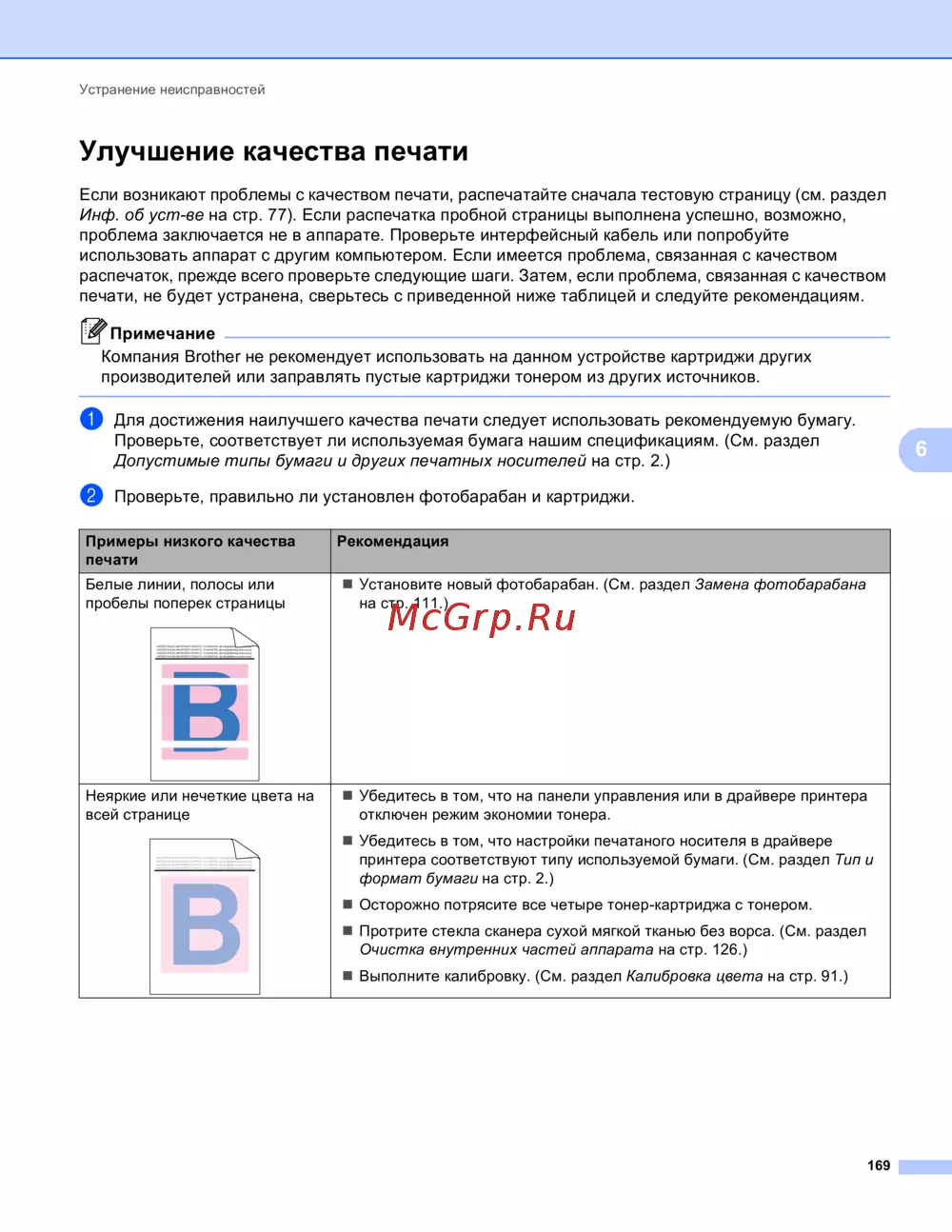 - Компания brother не рекомендует использовать на данном устройстве картриджи других производителей или заправлять пустые картриджи тонером из других источников p.174