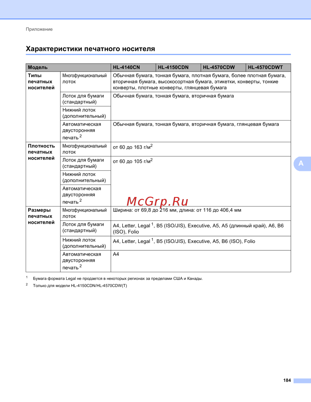 Brother HL-4140CN [189/214] Характеристики печатного носителя