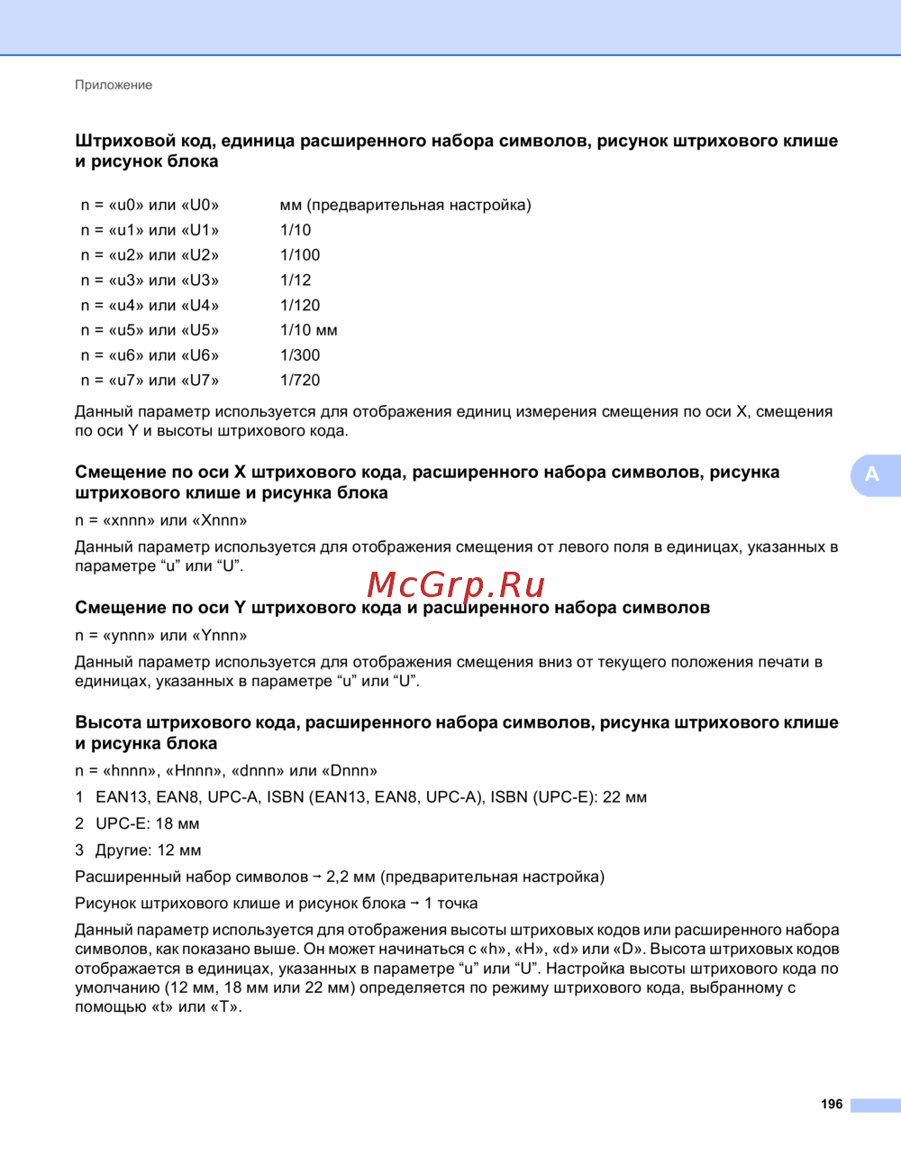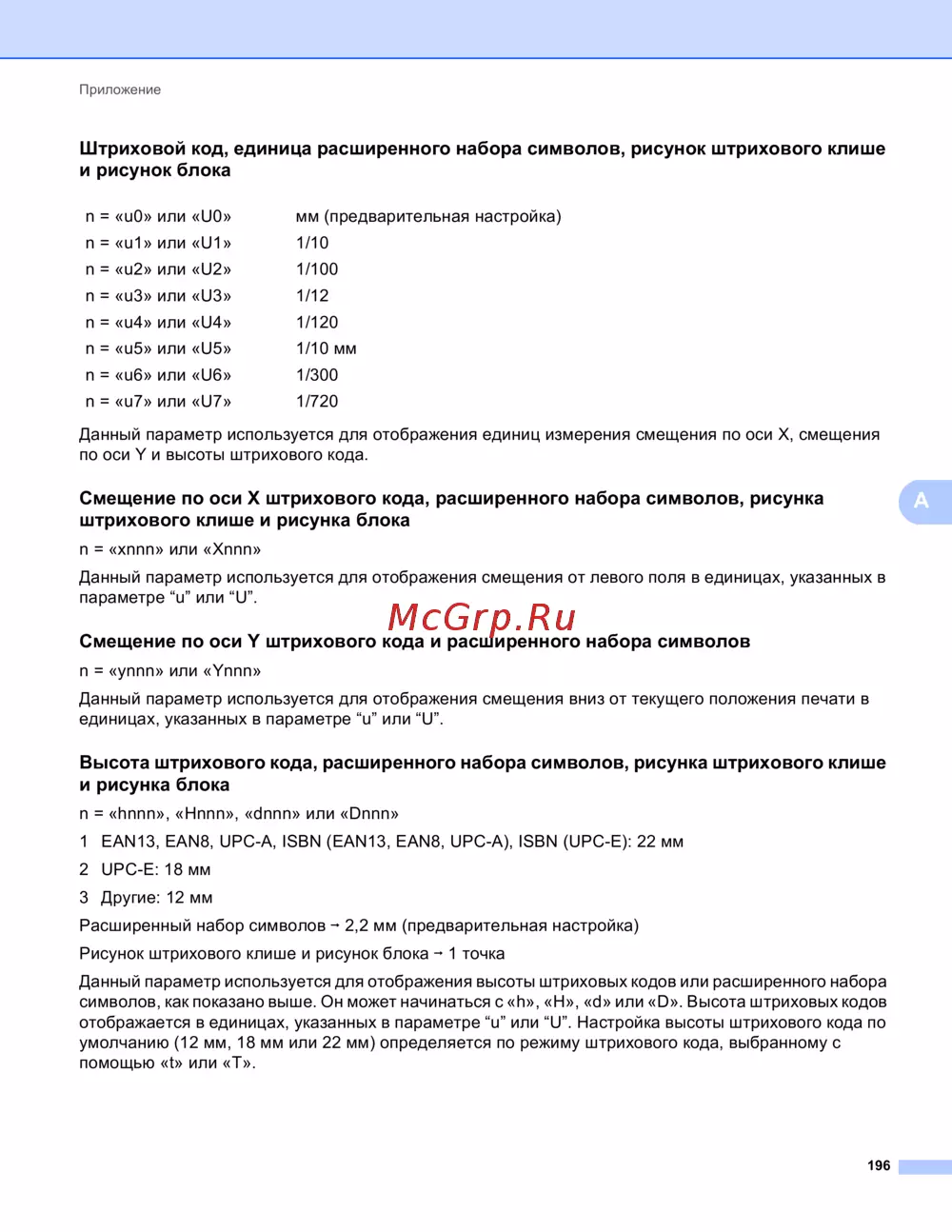 - Смещение по оси y штрихового кода и расширенного набора символов p.201