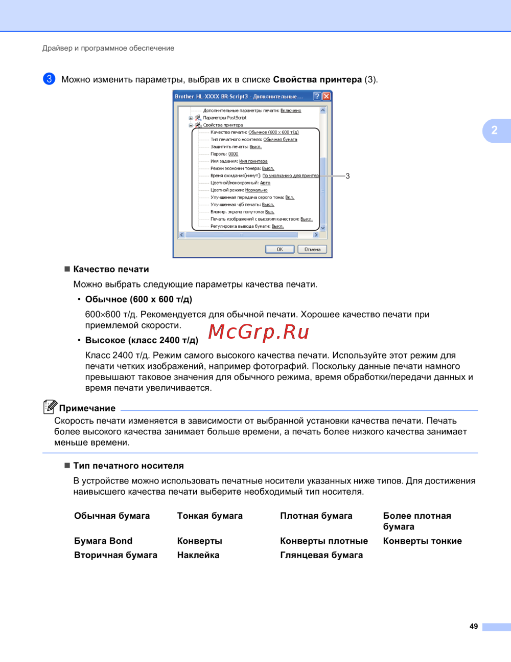 Brother HL-4140CN — настройки качества печати и типы носителей для принтера [54/214]