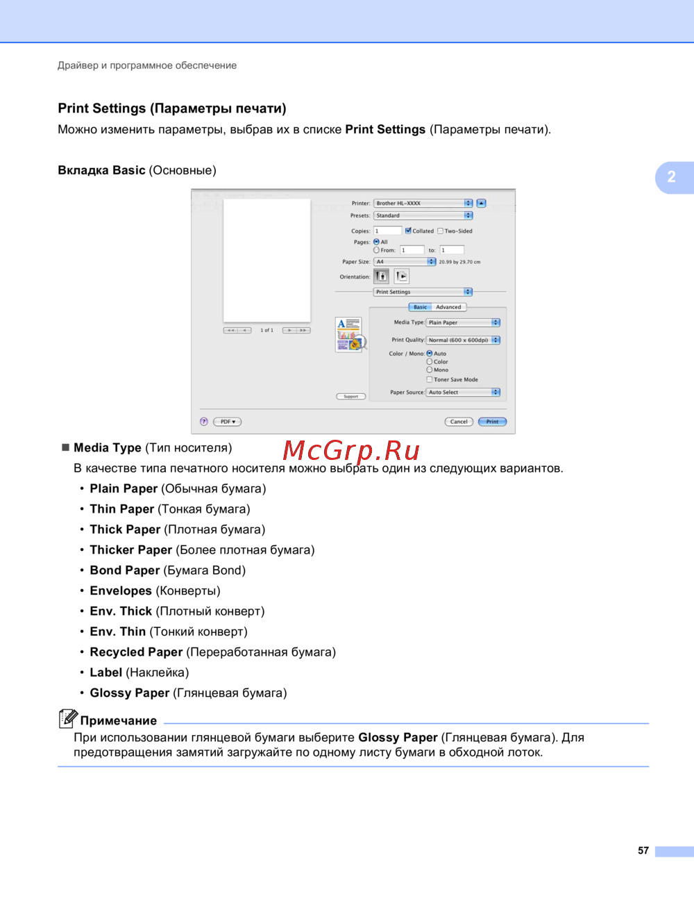 Brother HL-4140CN — настройка параметров печати для различных типов носителей [62/214]