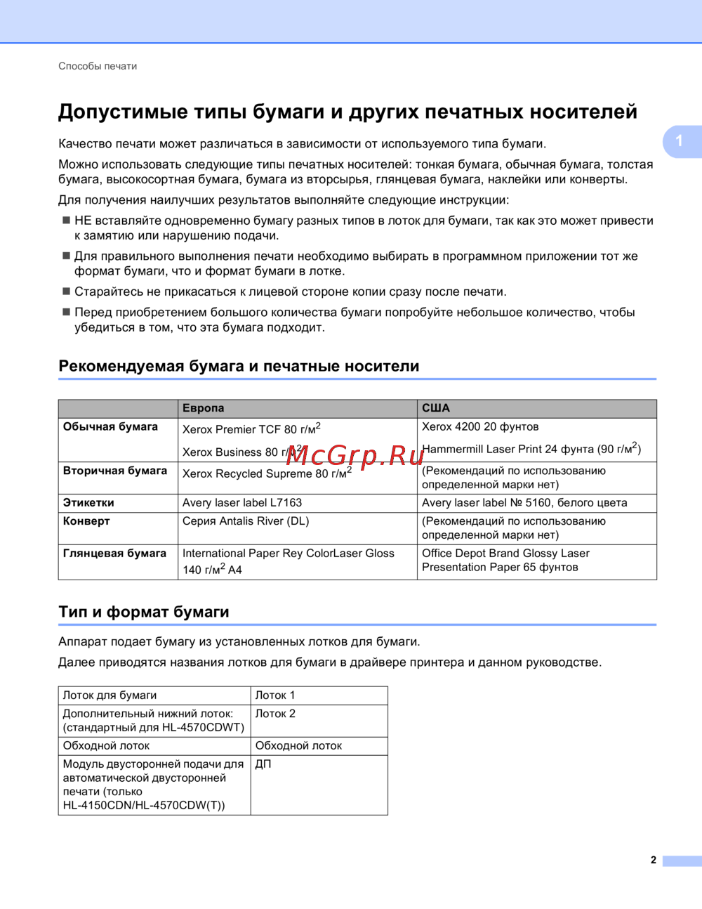 - Далее приводятся названия лотков для бумаги в драйвере принтера и данном руководстве p.7