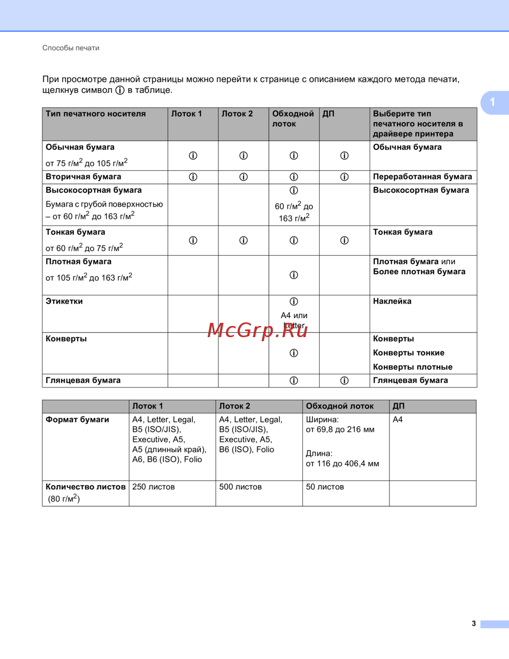 Тип печатного носителя Лоток 1 Лоток 2 Обходной