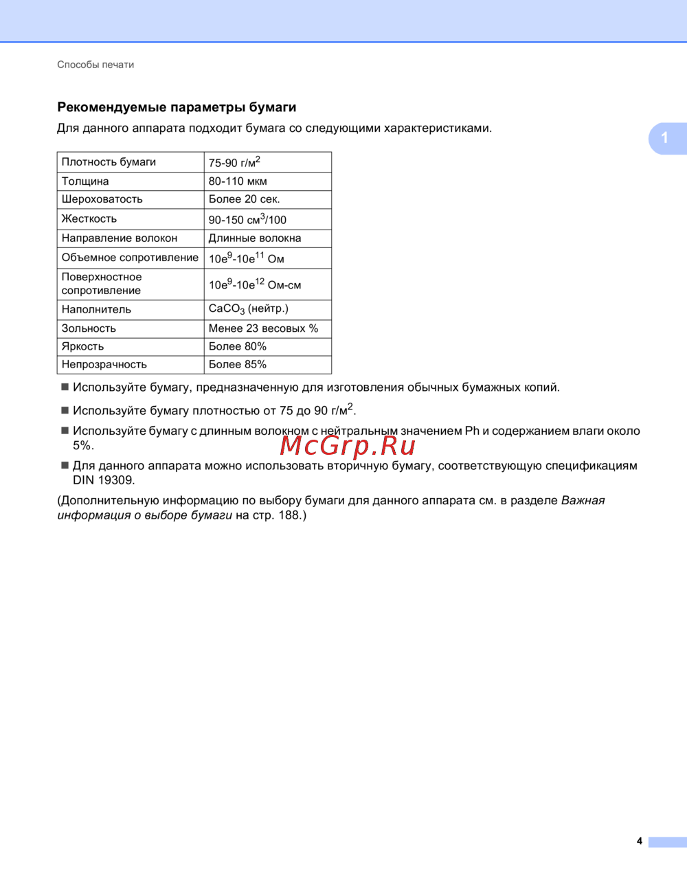 Рекомендуемые параметры бумаги 1