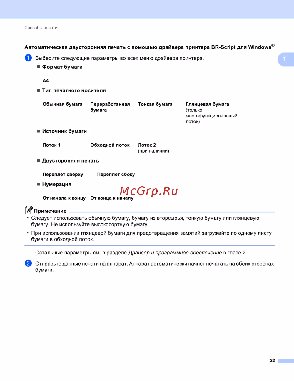 Автоматическая двусторонняя печать с помощью драйвера принтера BR-Script для Windows