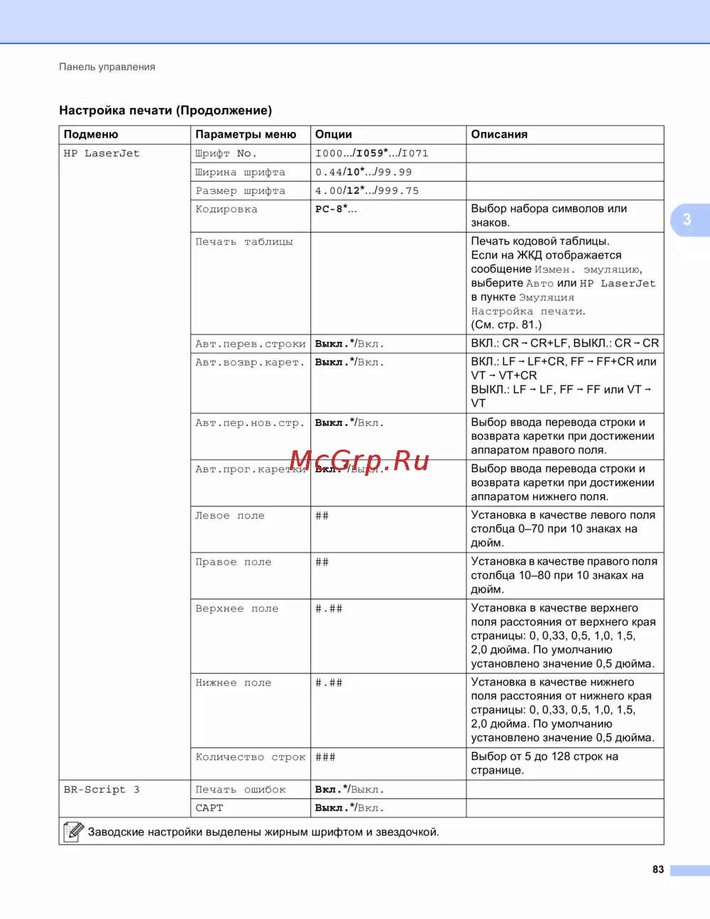 Заводские настройки выделены жирным шрифтом и звездочкой.