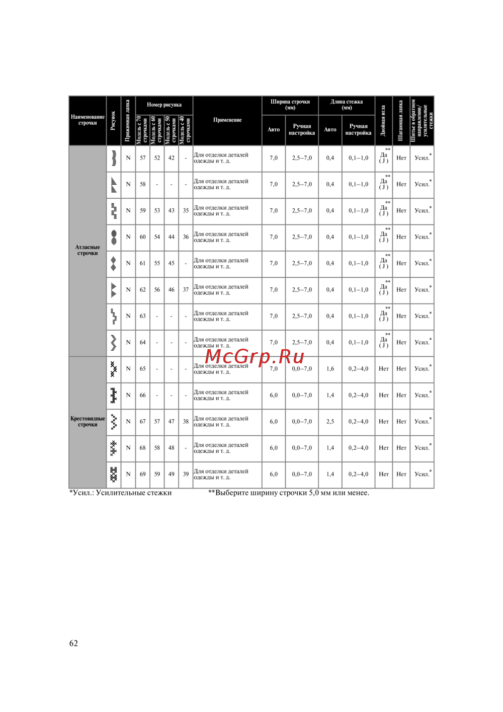 - Усил усилительные стежки выберите ширину строчки 5 0 мм или менее p.62