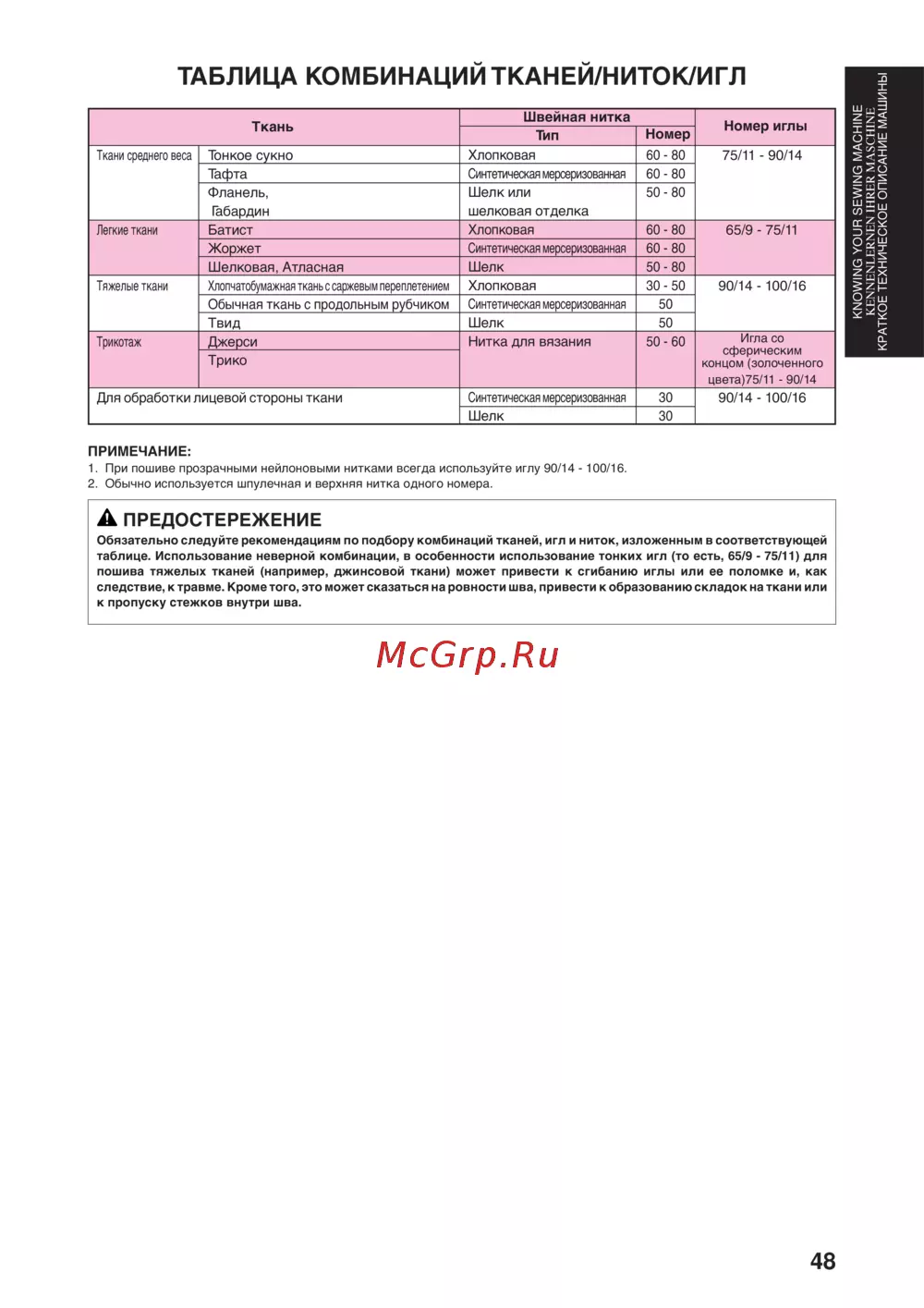 Обязательно следуйте рекомендациям по подбору комбинаций тканей, игл и ниток, изложенным в соответствующей