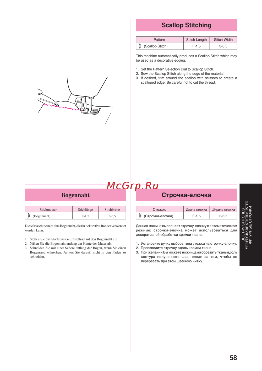 Откройте для себя 58 встроенных стежков для швейных машин, включая строчку-елочку и богеннаht. Идеально для создания декоративных краев и отделки тканей.