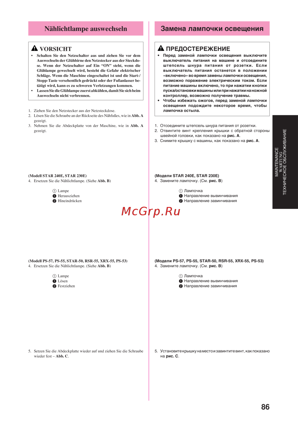 4. Ersetzen Sie die Nählichtlampe. (Siehe Abb. B)