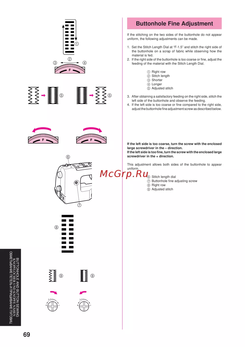 adjust the buttonhole fine adjustment screw as described below.