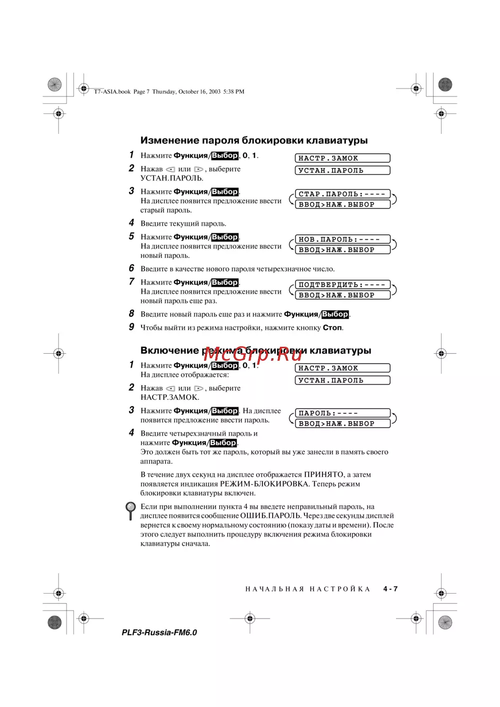дисплее появится сообщение ОШИБ.ПАРОЛЬ. Через две секунды дисплей