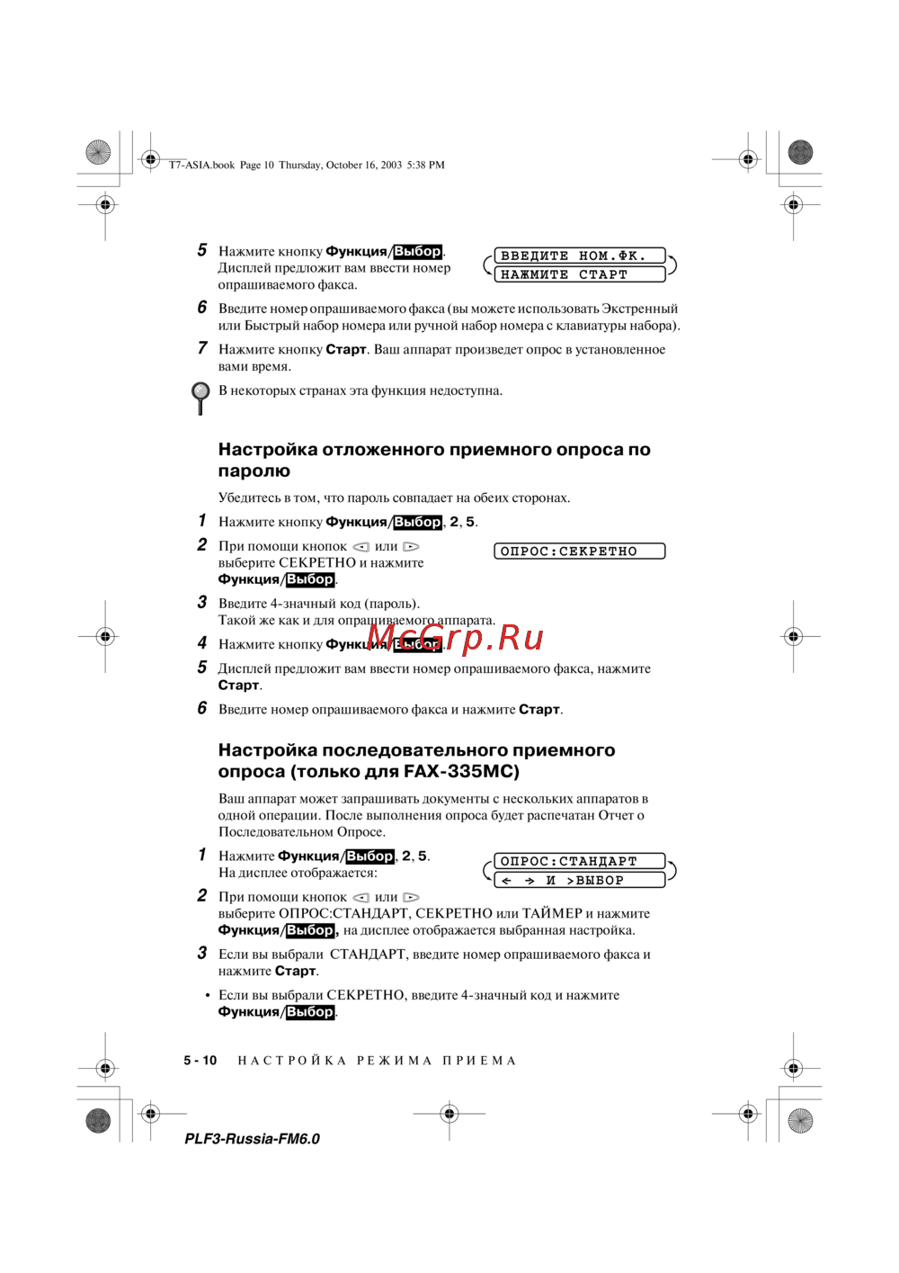 - Использование кода дистанционного доступа к считыванию сообщений только для fax 335mc p.106