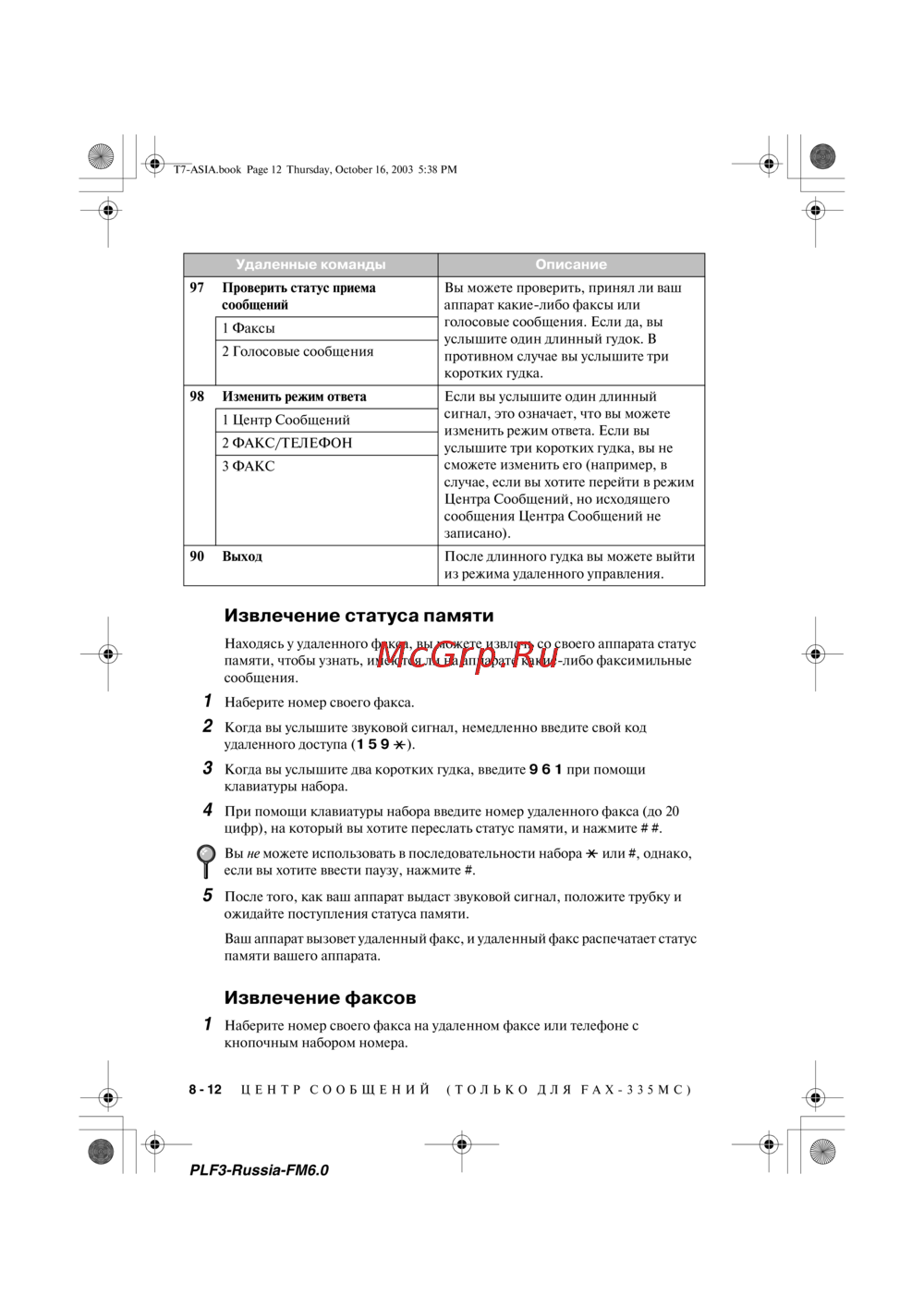 - Использование кода дистанционного доступа к считыванию сообщений только для fax 335mc p.106
