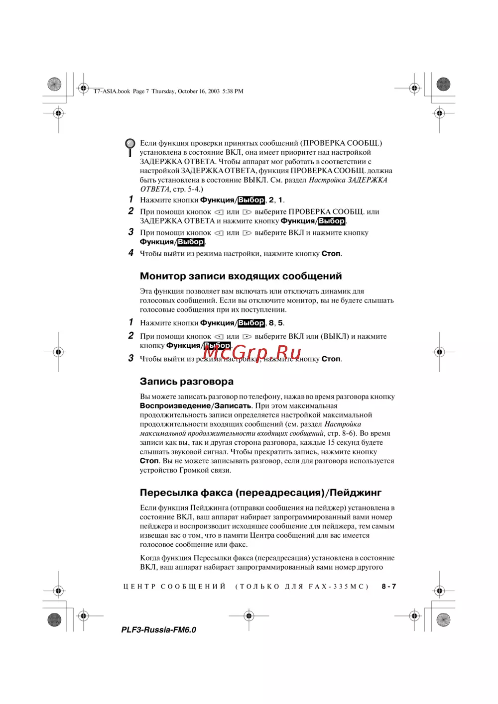 ЦЕНТР СООБЩЕНИЙ (ТОЛЬКО ДЛЯ FAX335MC)