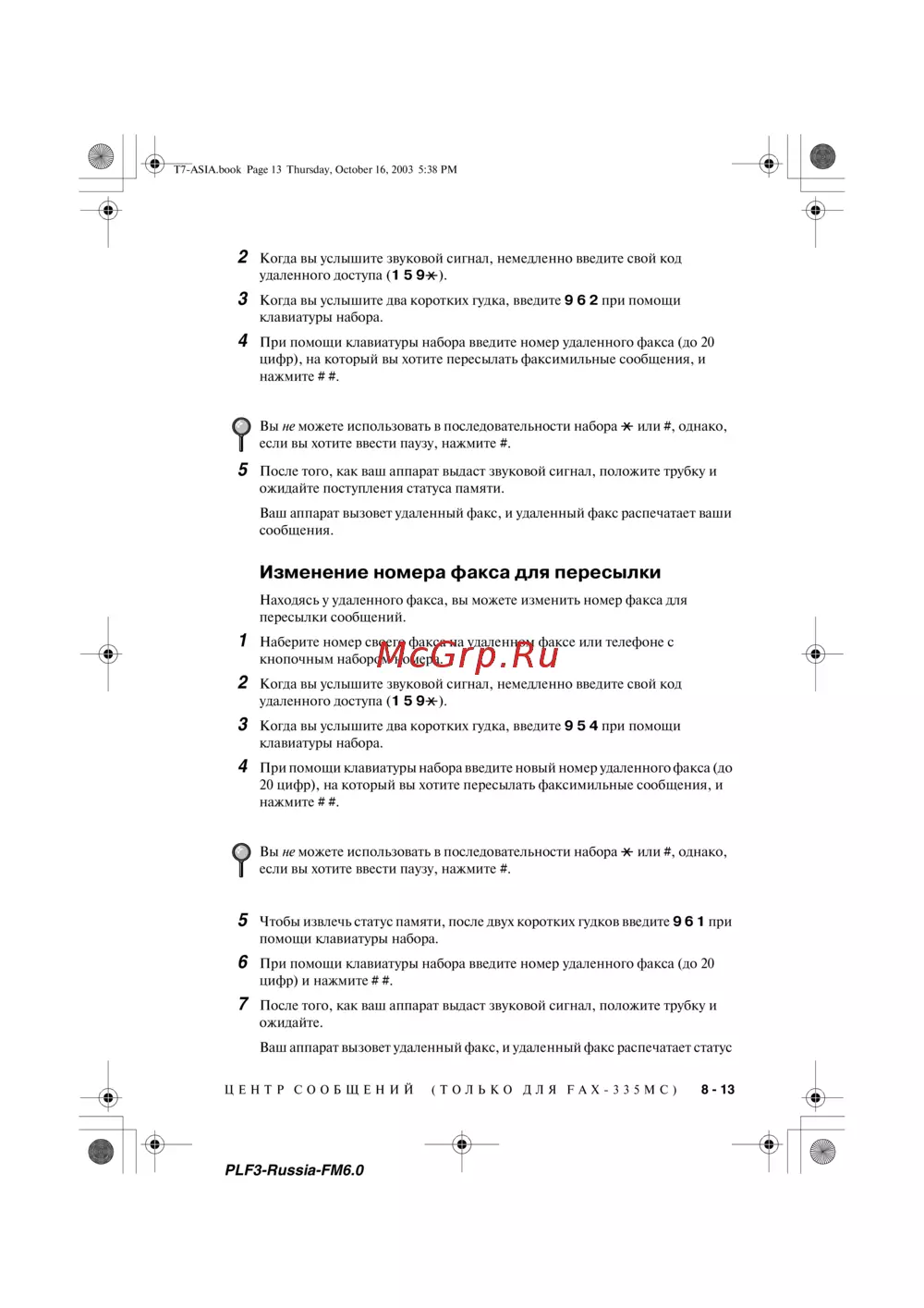 - Использование кода дистанционного доступа к считыванию сообщений только для fax 335mc p.106