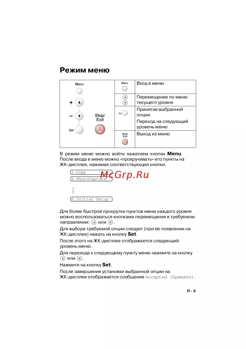 В режим меню можно войти нажатием кнопки Menu.