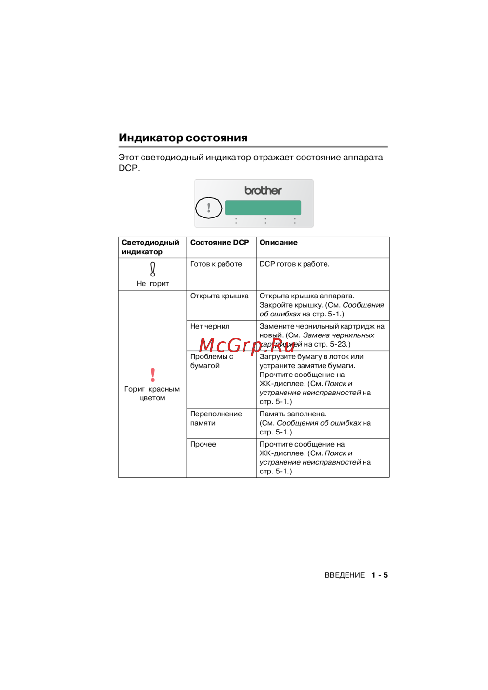 Brother DCP-310CN — индикатор состояния аппарата: что означают сигналы [19/122]