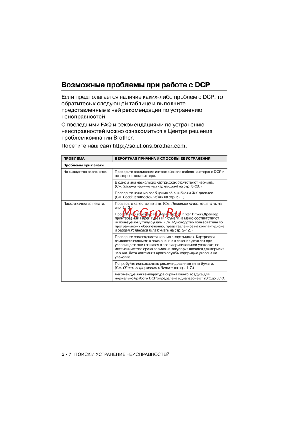 - Если предполагается наличие каких либо проблем с dcp то обратитесь к следующей таблице и выполните представленные в ней рекомендации по устранению неисправностей с последними faq и рекомендациями по устранению неисправностей можно ознакомиться в центре решения проблем компании brother посетите наш сайт http solutions brother com p.76