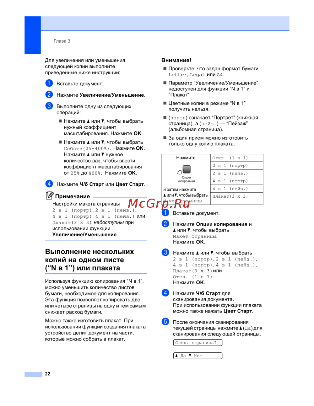 Узнайте, как правильно использовать функции увеличения, уменьшения и копирования документов. Сократите расход бумаги с помощью режима 'N в 1' и создавайте плакаты.