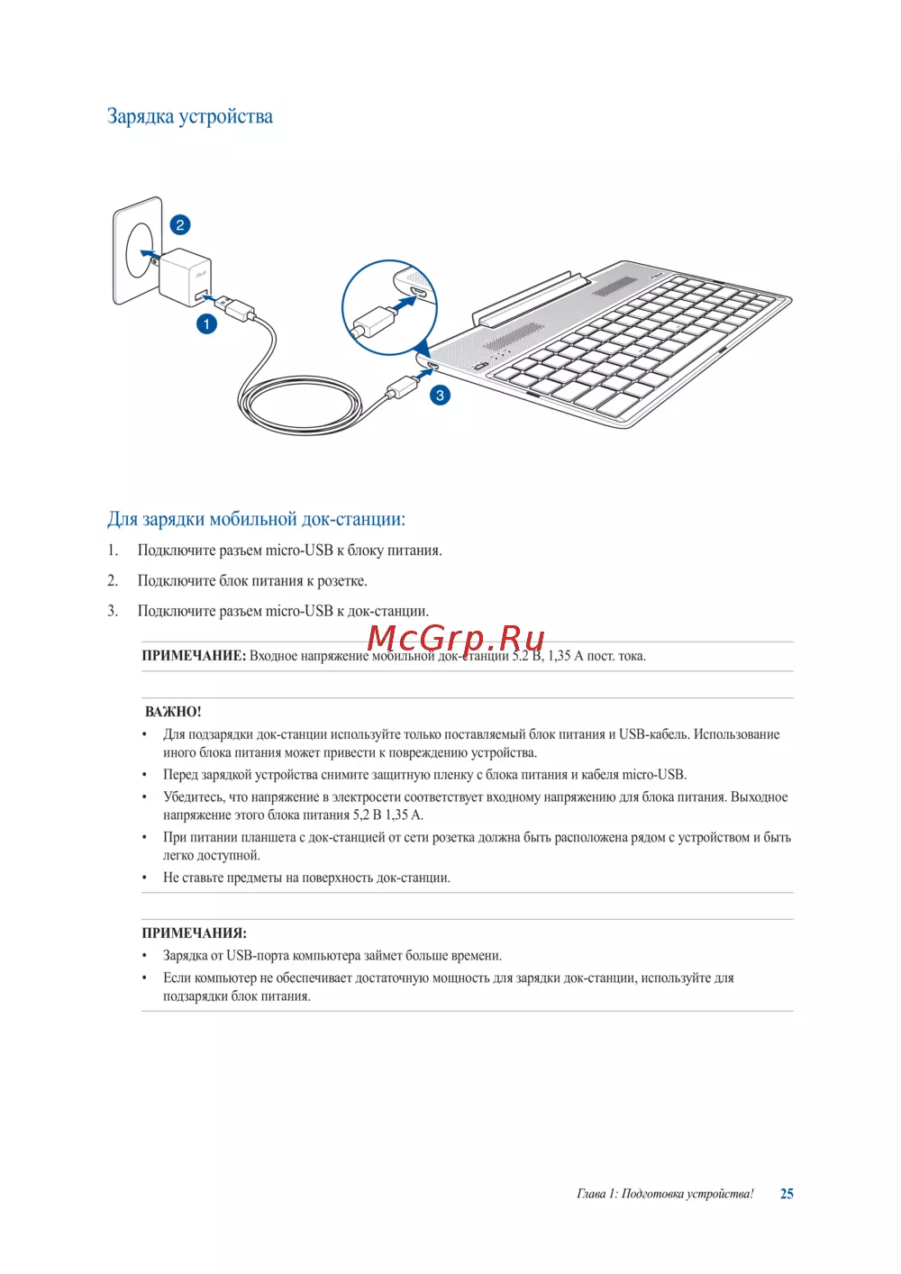 ПРИМЕЧАНИЕ: Входное напряжение мобильной док-станции 5.2 В, 1,35 А пост. тока.