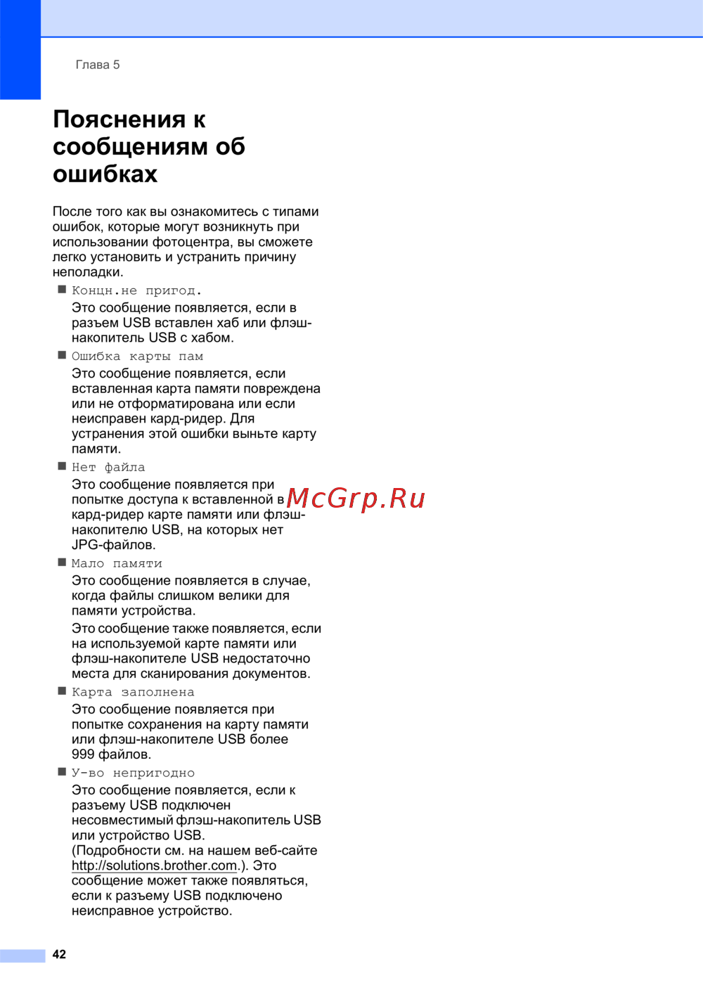 - Вы можете самостоятельно устранить большинство сообщений об ошибках и выполнить стандартные операции обслуживания если требуется дополнительная помощь в центре поддержки brother brother solutions center можно получить ответы на часто задаваемые вопросы и рекомендации по устранению неисправностей p.71