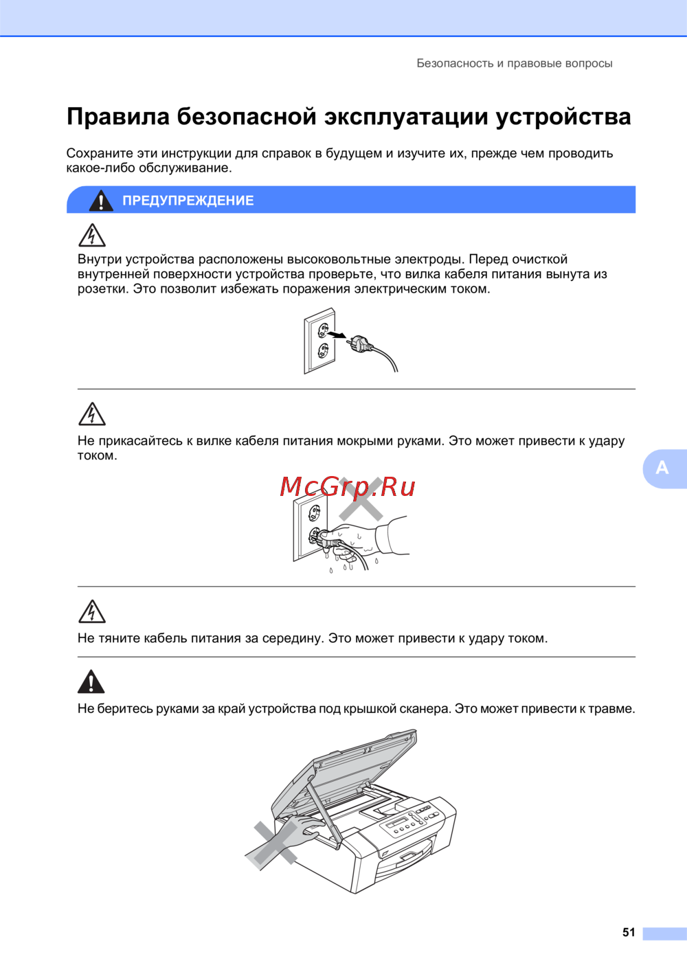 - Не беритесь руками за край устройства под крышкой сканера это может привести к травм p.59