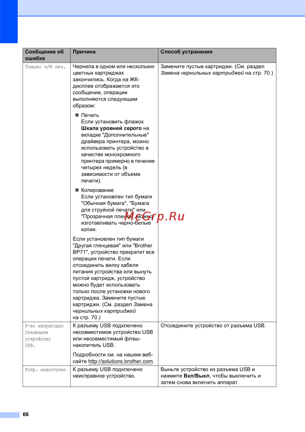 - Вы можете самостоятельно устранить большинство сообщений об ошибках и выполнить стандартные операции обслуживания если требуется дополнительная помощь в центре поддержки brother brother solutions center можно получить ответы на часто задаваемые вопросы и рекомендации по устранению неисправностей p.71