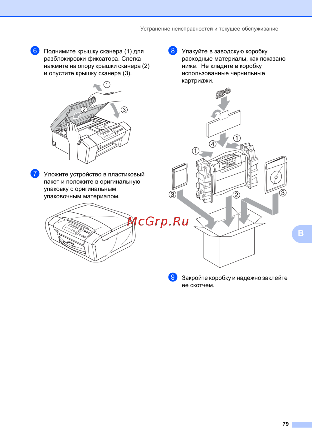 Научитесь правильно устранять неисправности и обслуживать сканеры. Узнайте, как упаковать устройство и расходные материалы для безопасной транспортировки.