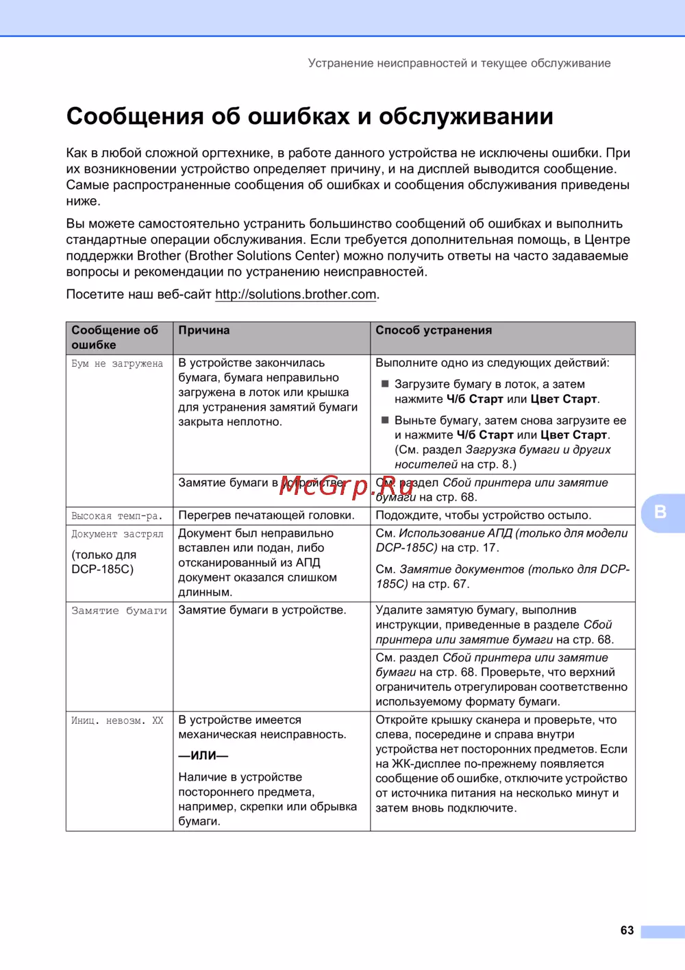 - Вы можете самостоятельно устранить большинство сообщений об ошибках и выполнить стандартные операции обслуживания если требуется дополнительная помощь в центре поддержки brother brother solutions center можно получить ответы на часто задаваемые вопросы и рекомендации по устранению неисправностей p.71