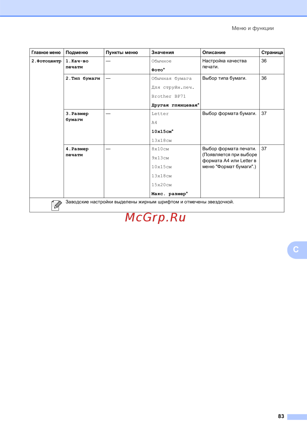 Заводские настройки выделены жирным шрифтом и отмечены звездочкой.