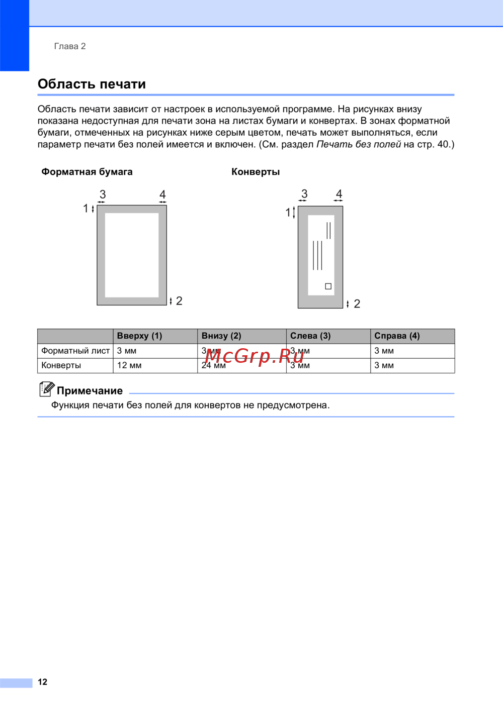 - Область печати зависит от настроек в используемой программе на рисунках внизу показана недоступная для печати зона на листах бумаги и конвертах в зонах форматной бумаги отмеченных на рисунках ниже серым цветом печать может выполняться если параметр печати без полей имеется и включен см раздел печать без полей на стр 40 p.20