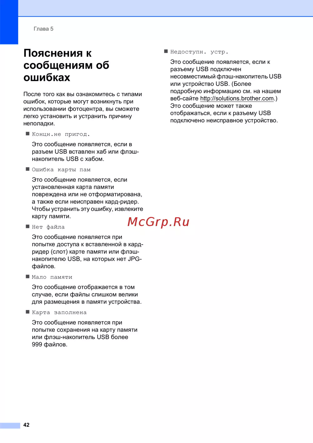 Brother DCP-197C — пояснения к сообщениям об ошибках фотоцентра: типы и устранение неполадок [50/118]