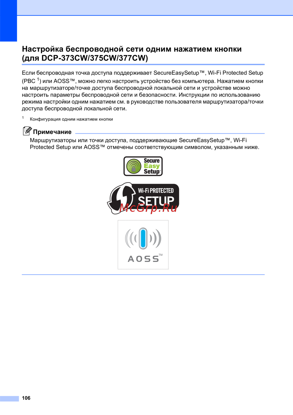 - Настройка беспроводной сети одним нажатием кнопки для dcp 373cw 375cw 377cw p.114