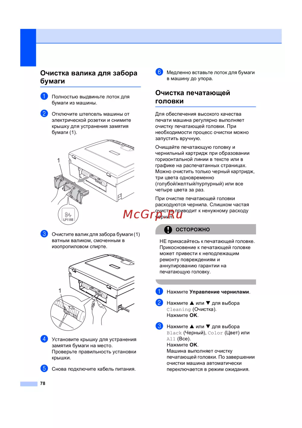 Brother DCP-330C — инструкции по очистке валика и печатающей головки устройства [86/117]