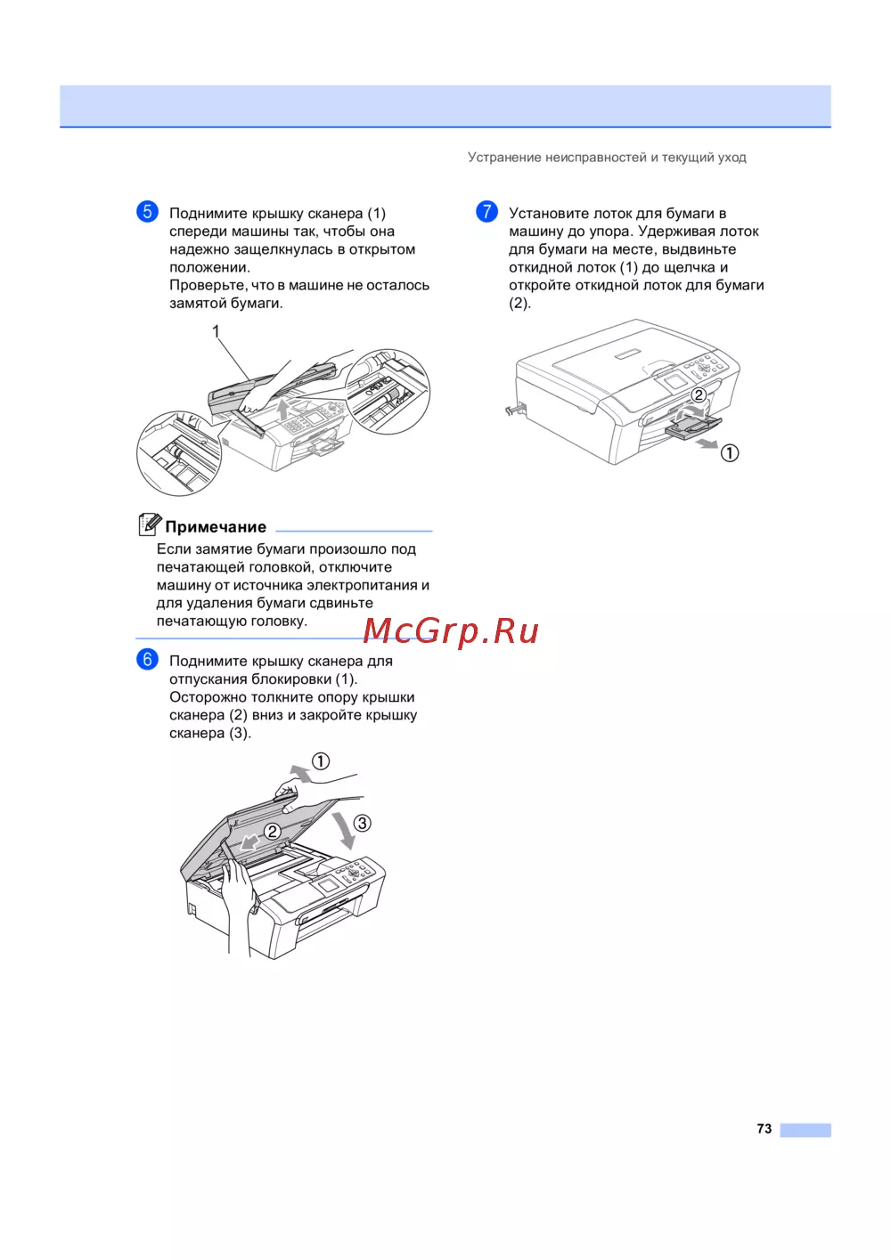 Узнайте, как правильно устранить неисправности и проводить уход за устройством. Подробные инструкции по работе с крышкой сканера и лотком для бумаги.