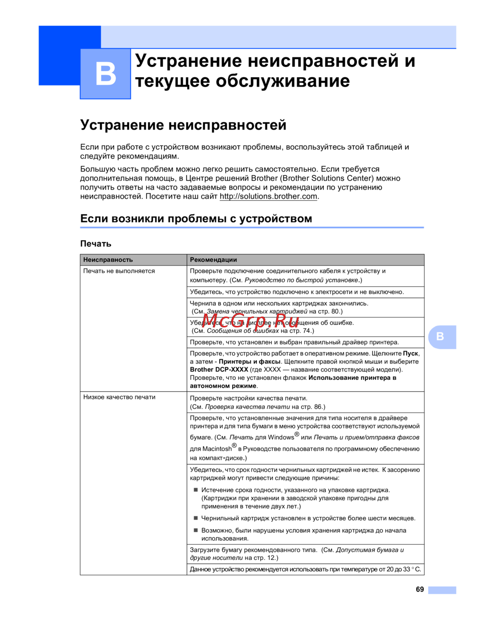 - Большую часть проблем можно решить самостоятельно если требуется дополнительная помощь в центре решений brother brother solutions center можно получить ответы на часто задаваемые вопросы и рекомендации по устранению неисправностей p.82