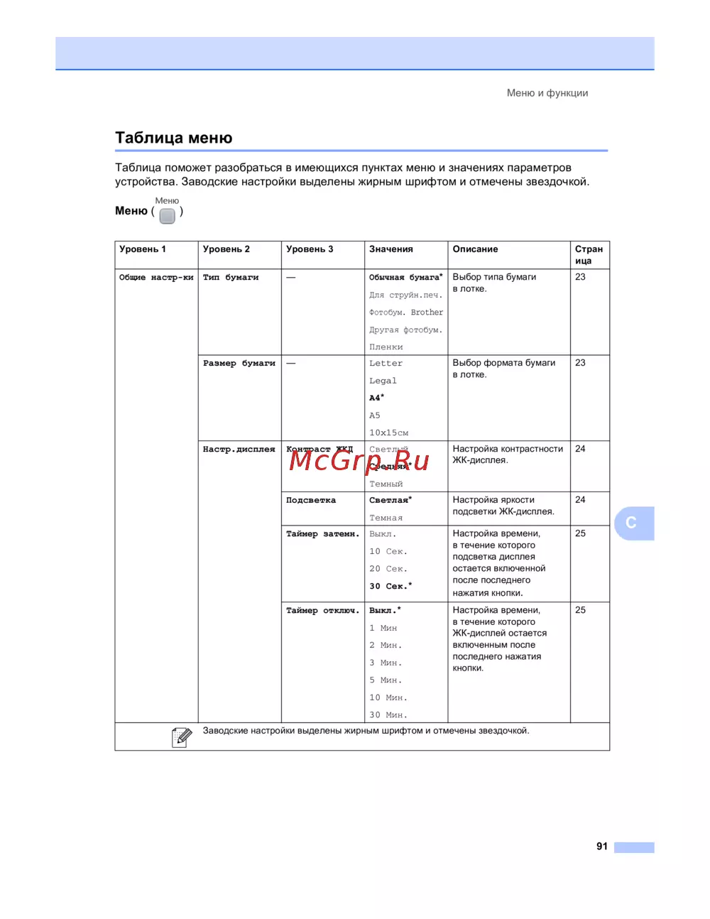 Заводские настройки выделены жирным шрифтом и отмечены звездочкой.