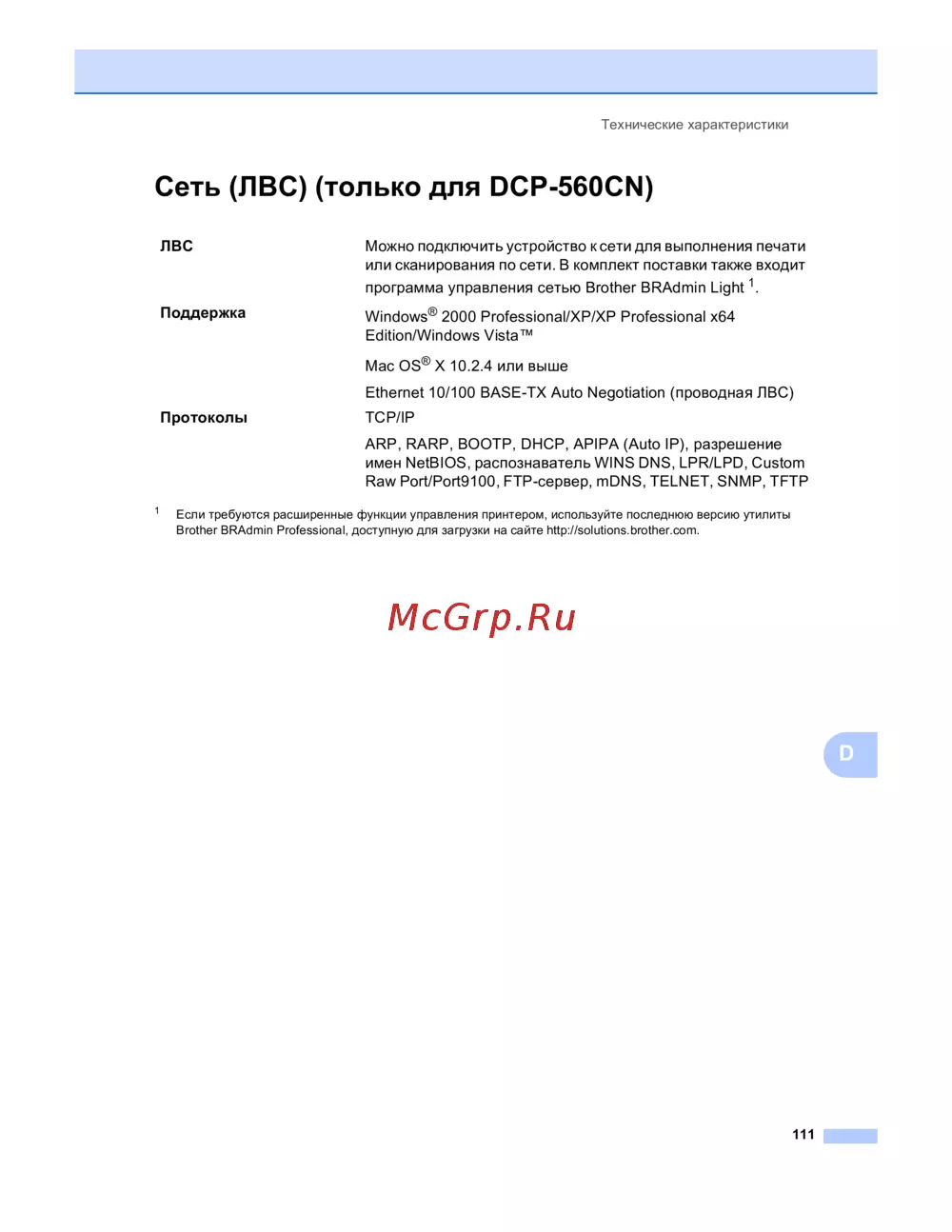Brother DCP-560CN — технические характеристики сетевых функций принтера [119/125]