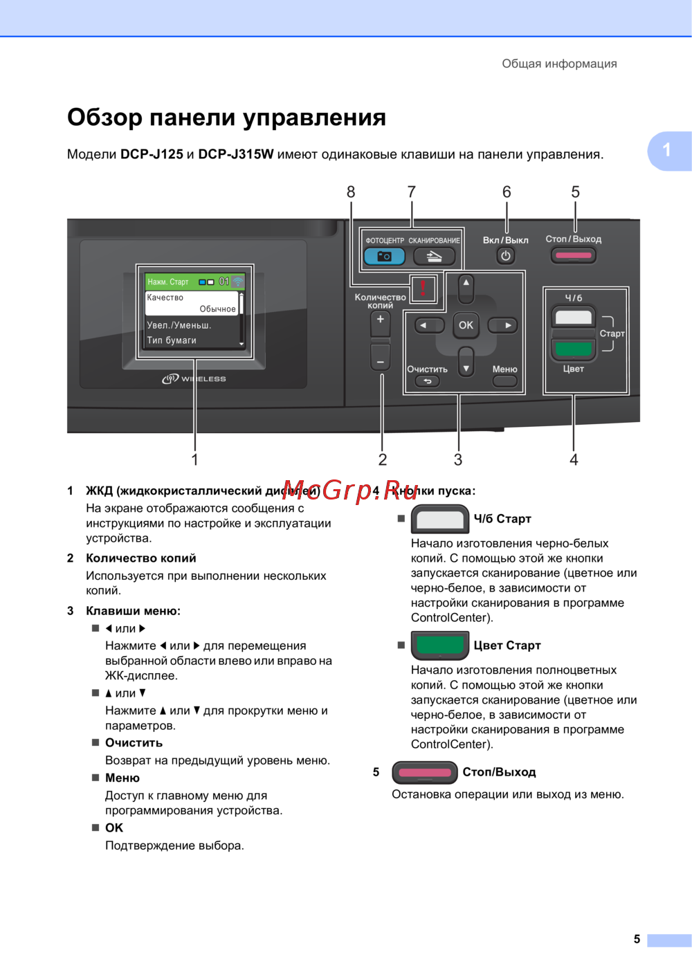 - Модели dcp j125 и dcp j315w имеют одинаковые клавиши на панели управления p.13