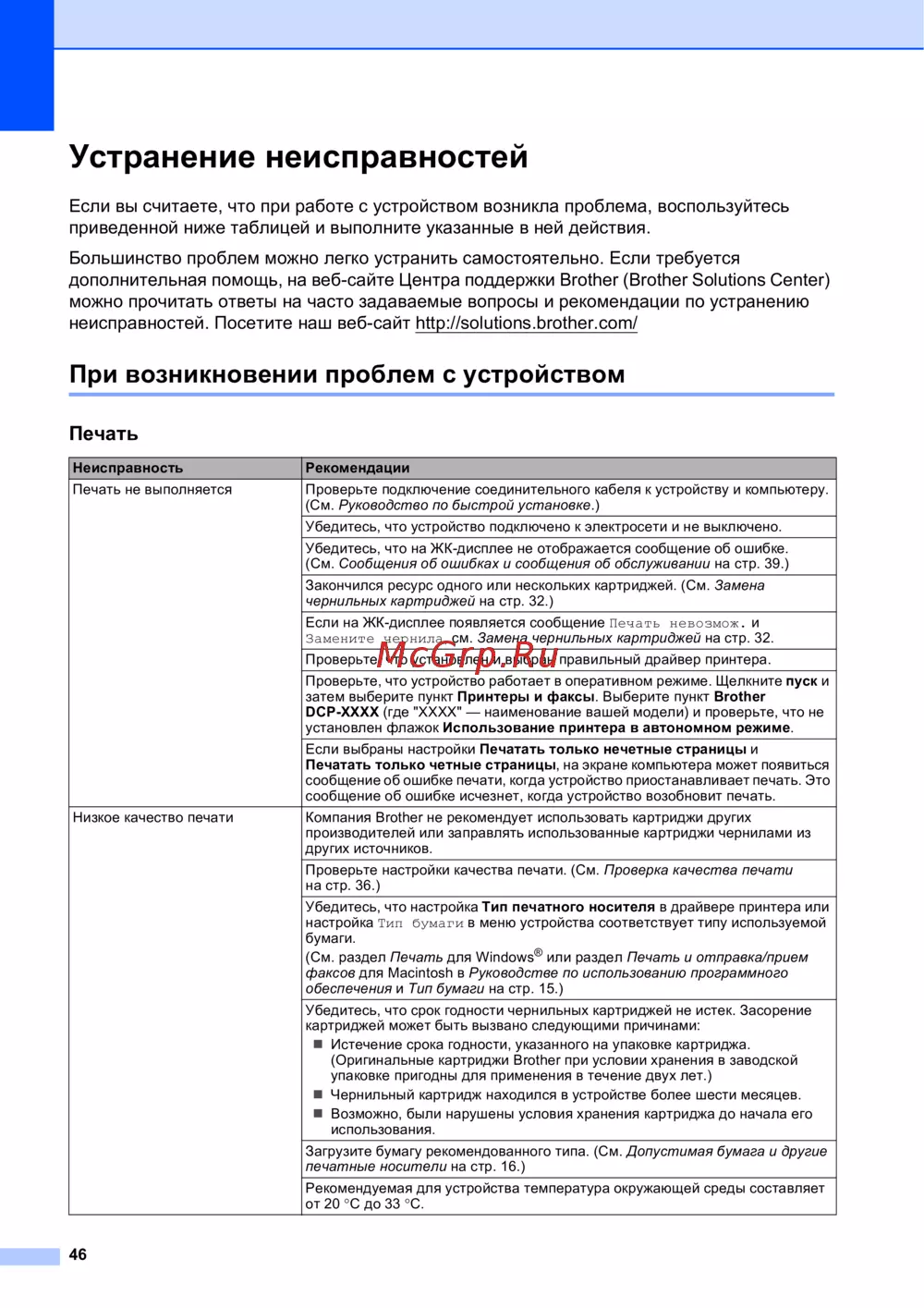 - Большинство проблем можно легко устранить самостоятельно если требуется дополнительная помощь на веб сайте центра поддержки brother brother solutions center можно прочитать ответы на часто задаваемые вопросы и рекомендации по устранению неисправностей посетите наш веб сайт http solutions brother com p.54